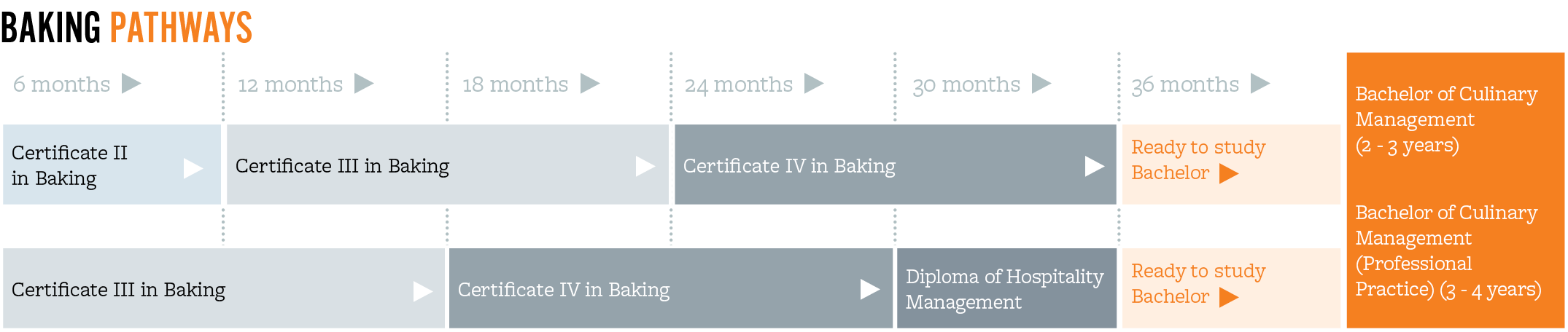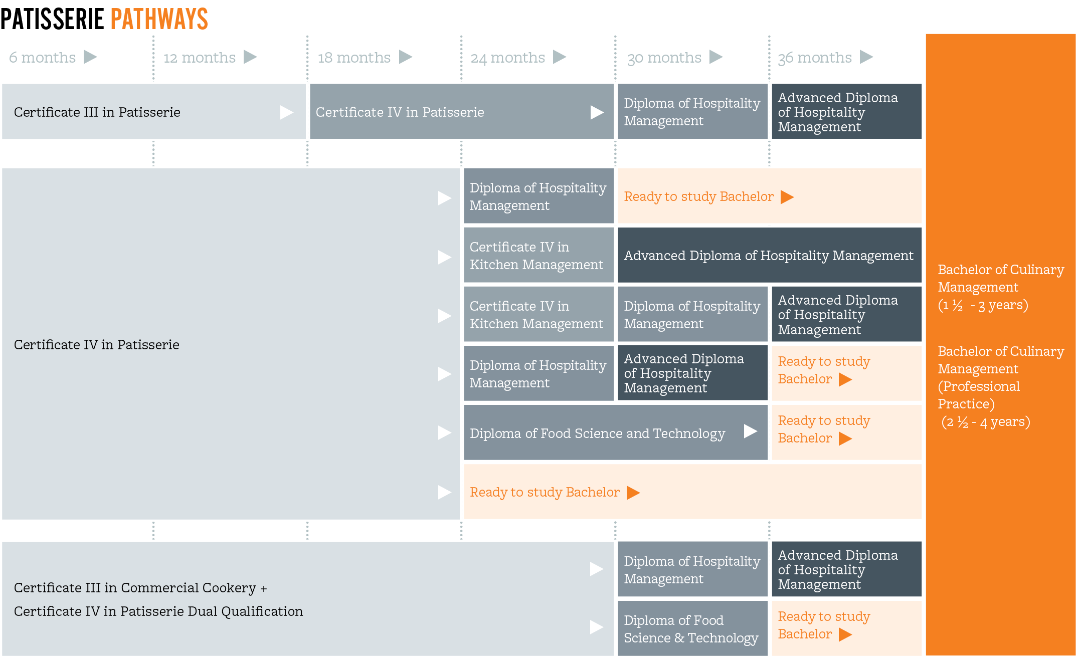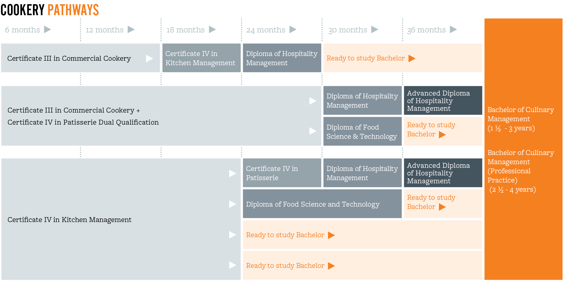 There are many entry and exit points to allow flexible learning and pathways that match your needs. See the chart below for the multiple ways you can progress through William Angliss Institute into employment or further study.