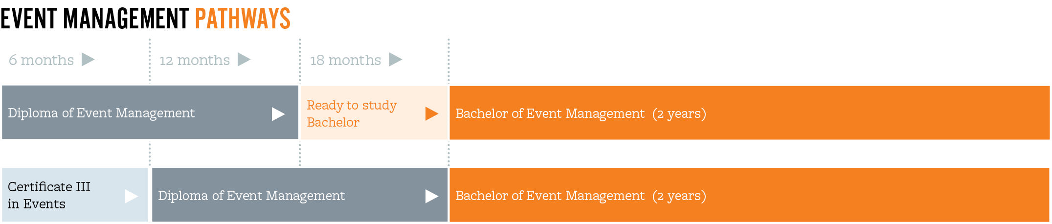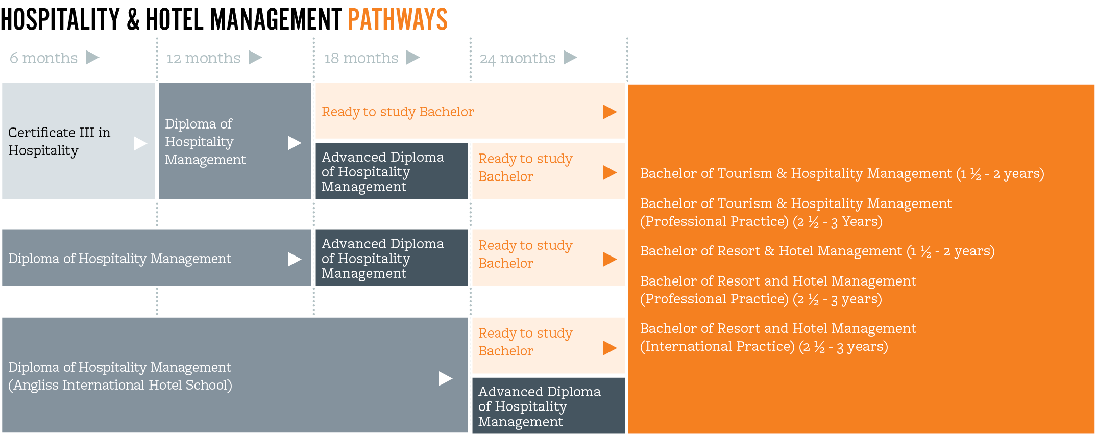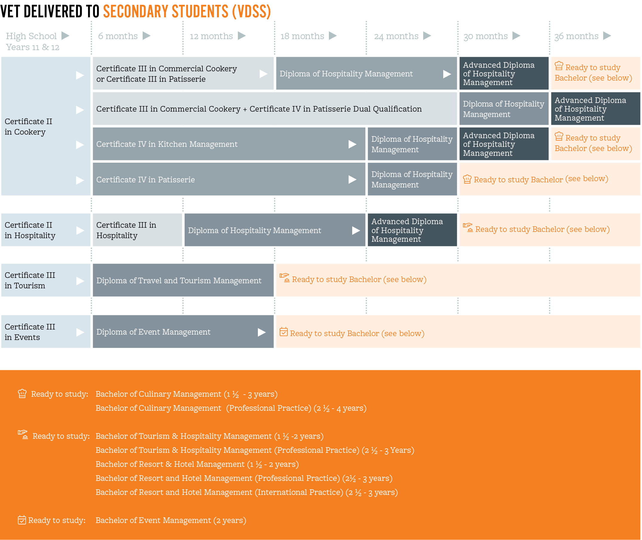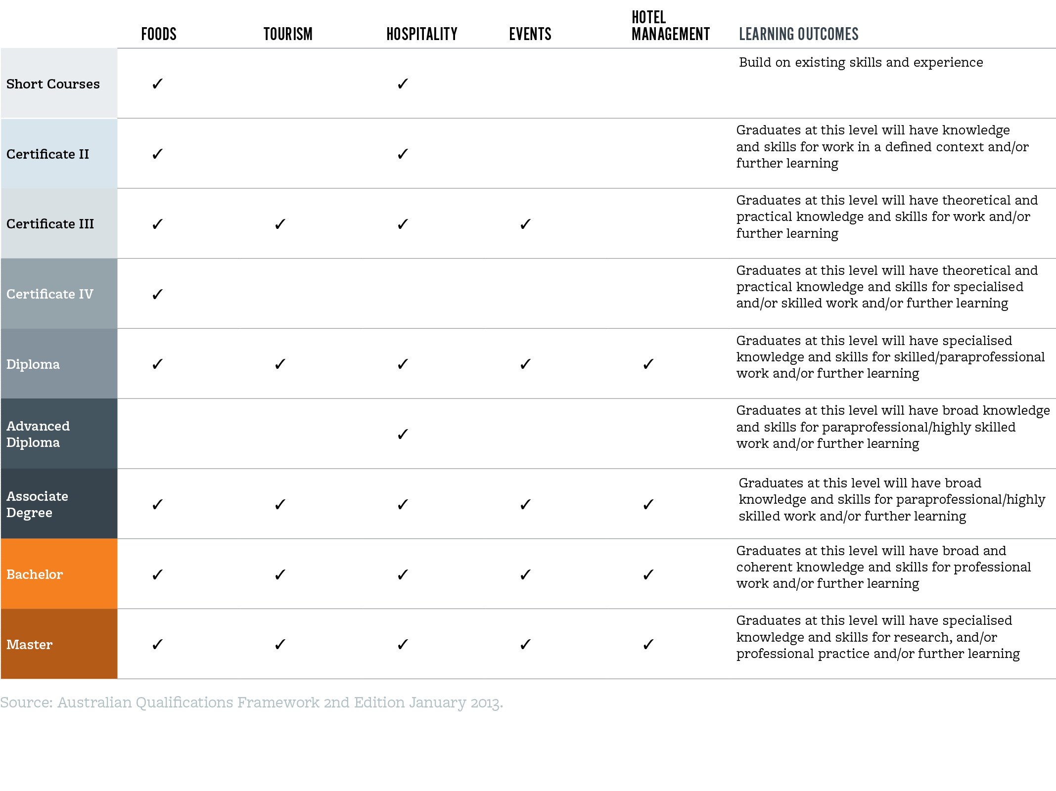 There are many entry and exit points to allow flexible learning and pathways that match your needs. See the chart below for the multiple ways you can progress through William Angliss Institute into employment or further study.